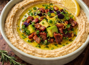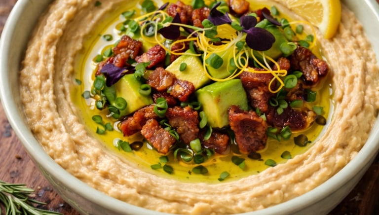Smooth, fresh, and creamy hummus topped with refreshing avocado and vegan "bacon".