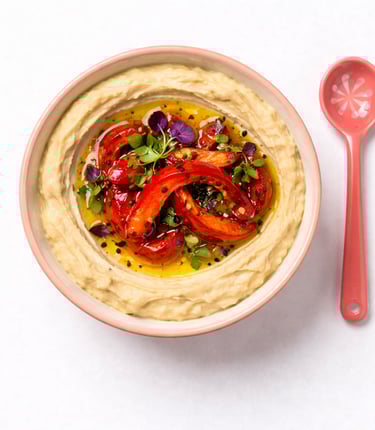 Creamy hummus with toppings that tell a story of freshness and care.